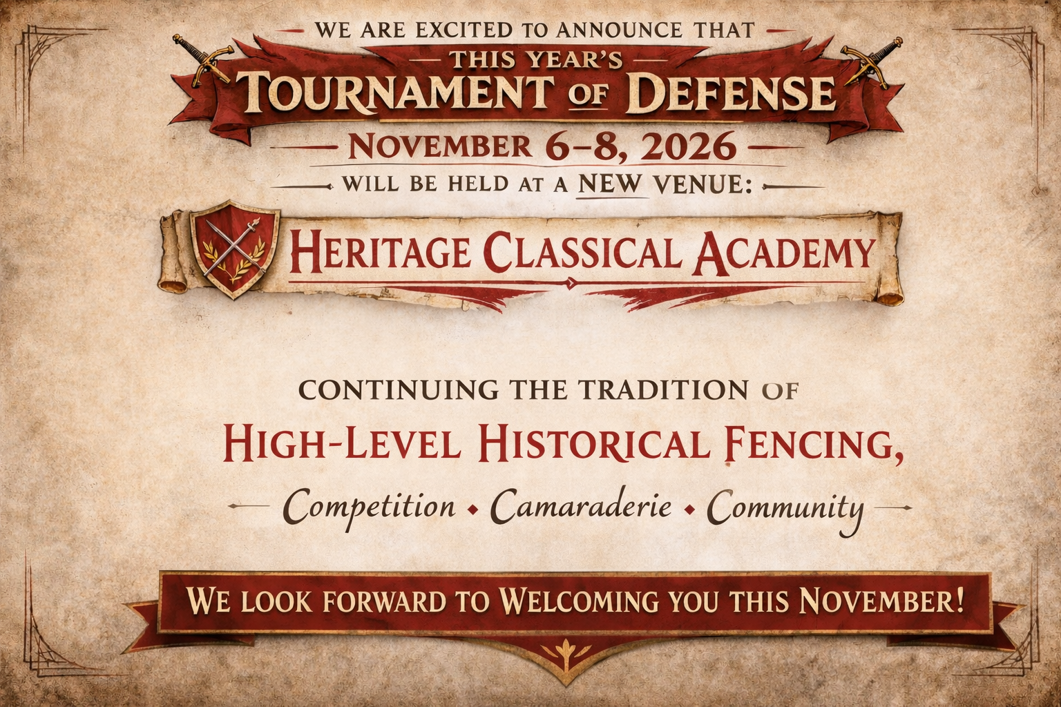 Tournaments · Workshops · Free Fencing · Performances will take place on the grounds of:HERITAGE CLASSICAL ACADEMY
